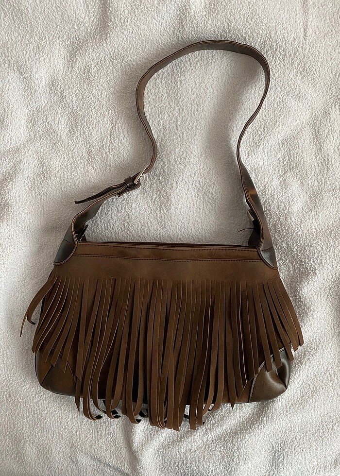 nubuk süet püsküllü vintage çanta. hiçbir sorunu yok, her kombinimle çok severek kullandım alana uğur getirir umarım. ✨