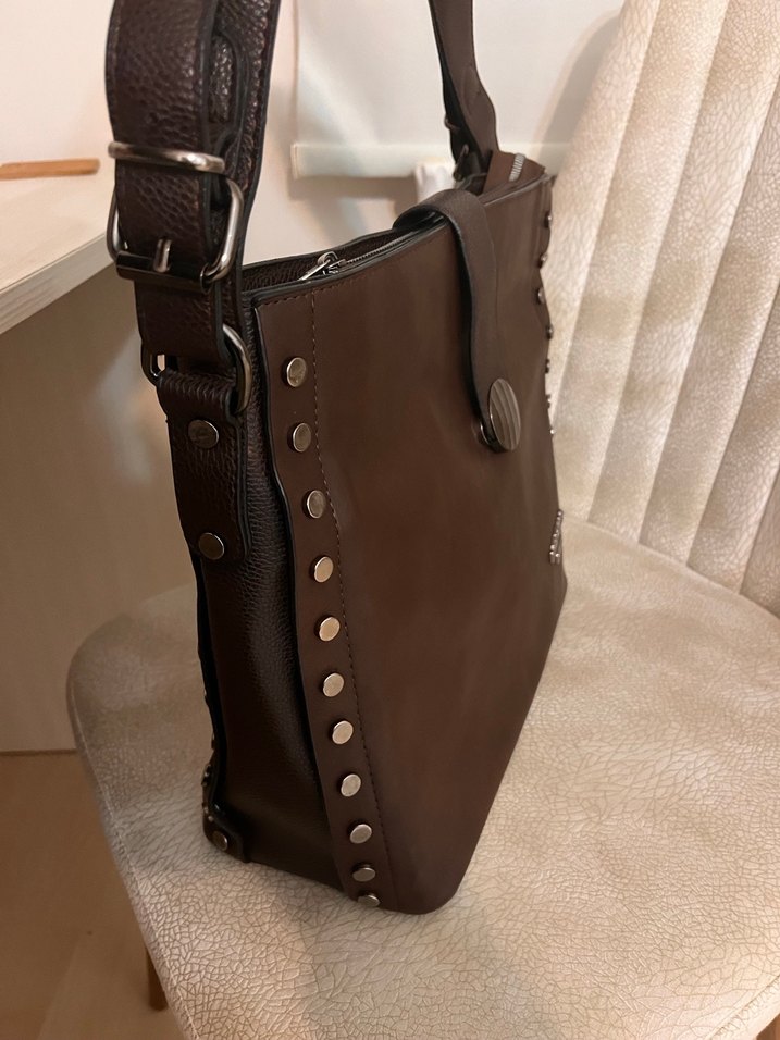 Koyu kahverengi deri biker tarzı kadın çanta, tokalı askı ve yanlarda metal çıtçıt detaylarıyla şık ve kullanışlıdır.