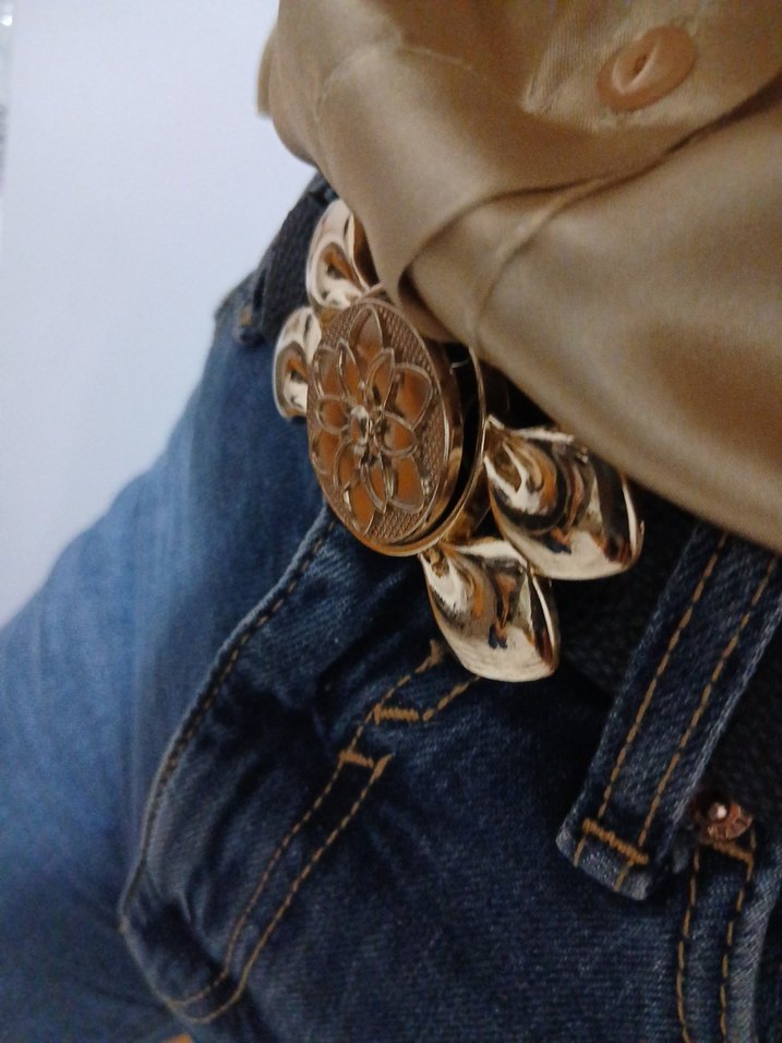 Kadın kot kemeri, parlak altın renkli çiçek desenli tokasıyla nostaljik Paris sokak modası havası katıyor.