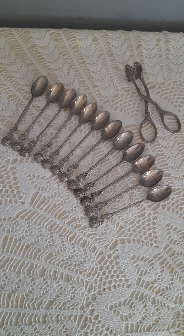 Detaylı saplara sahip gri bej tonlarında vintage tatlı kaşıkları ve uyumlu servis maşası seti. Şık masa düzenleri için uygun. ️çok eski bir ürün
