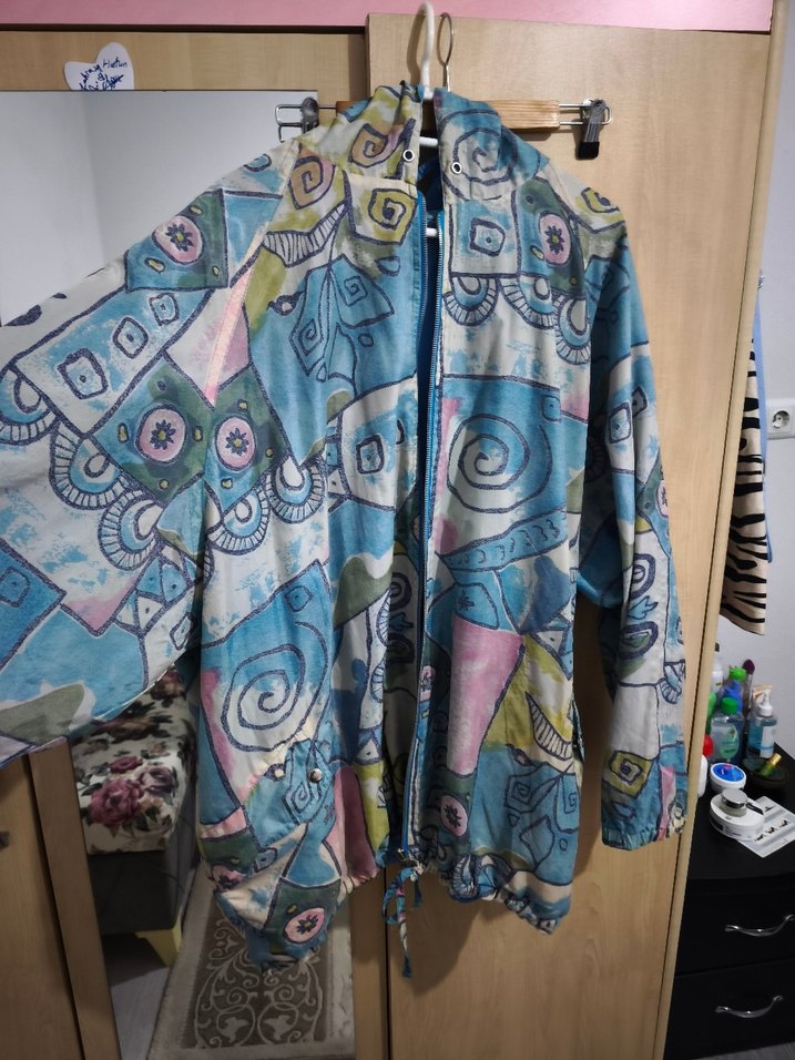 Bağcıklı ve fermuarlı, kapüşonlu bol kesim kadın ceket. Pastel çok renkli tie-dye desenli, uzun kollu ve midi boyda, sokak stili için uygun. çift tarafli