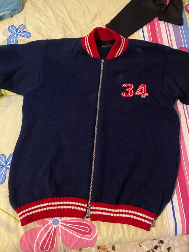 Erkekler için lacivert fermuarlı sweatshirt, uzun kollu ve dar kesimlidir. Yuvarlak yaka, kırmızı çizgili ribana manşet ve etek ucu ile 34 numara detayına sahiptir. Yumuşak polar kumaştan yapılmıştır, günlük kullanım için uygundur.