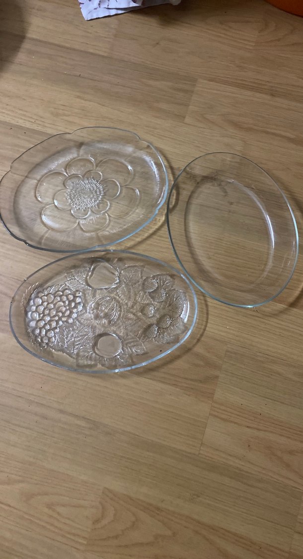 Vintage tarzda, çiçek desenli ve açık bej tonlarında cam tabak seti. Kabartmalı çiçek ve meyve motiflerine sahip üç farklı tabak içerir. ️