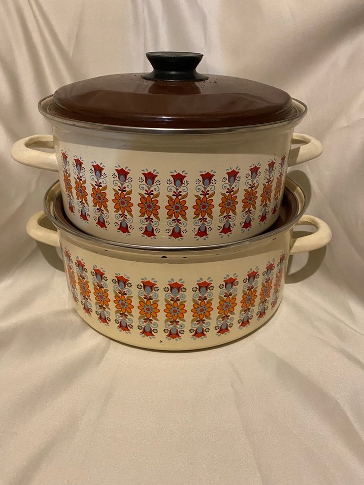 İki adet kahverengi emaye tencere, renkli çiçek desenleri ve koyu renk kapak içerir. Dayanıklı kulplara sahiptir.