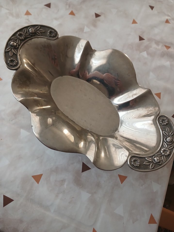 Parlak bej renkte, kulplarında çiçek desenleri bulunan vintage tarzda orjinal gümüş kaplama dekoratif tabak.