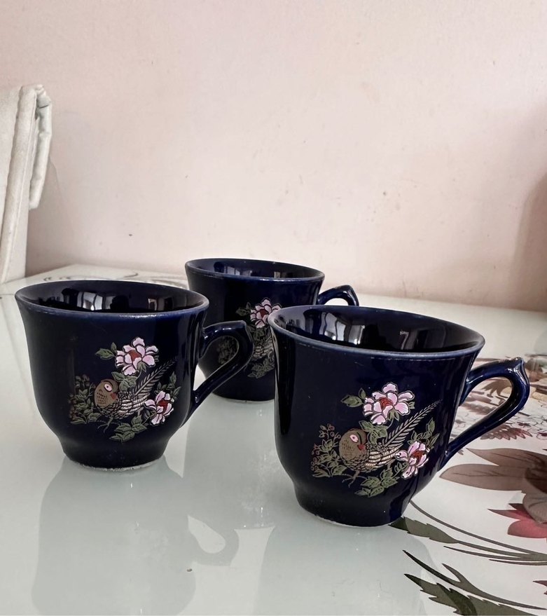1970’lerden cobalt mavisi sülün kuşlu 3 adet fincan. Tabakları yok. #antika #vintage #sülünkuşu