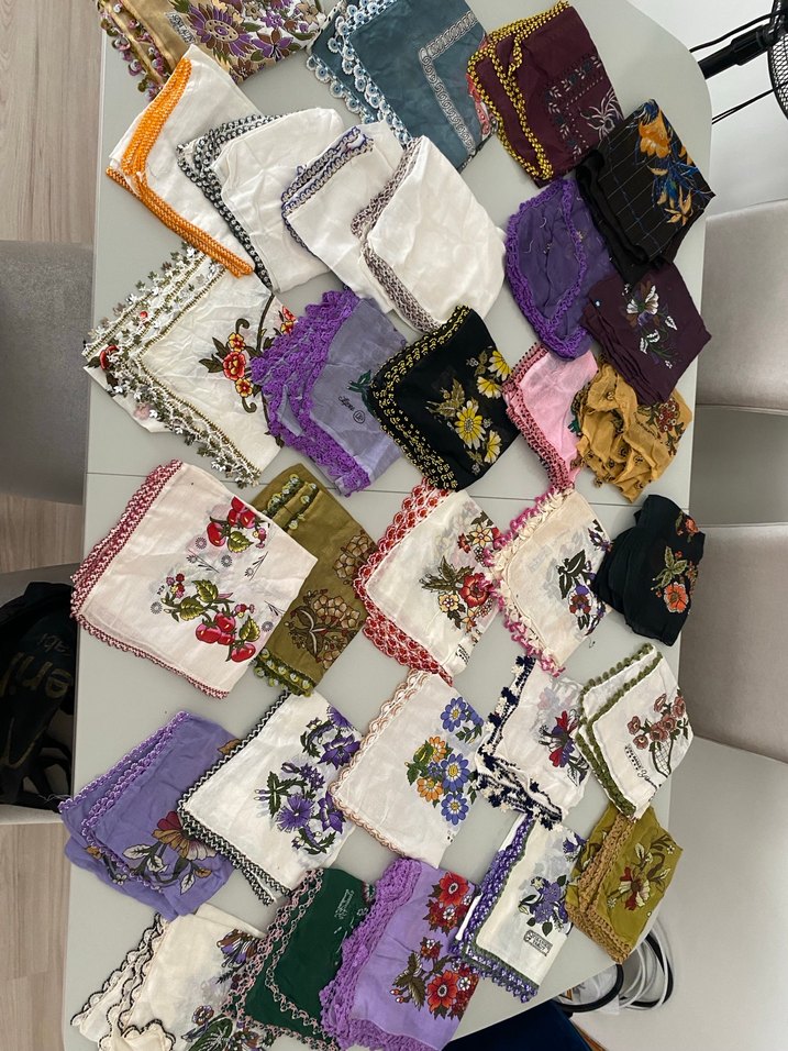 Vintage tarzda, dantel detaylı, çeşitli koyu ve canlı renklerde, çiçek işlemeli kadın fuları.