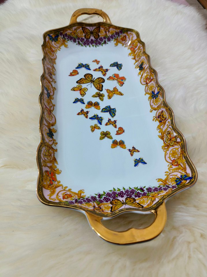 Vintage tarzda, çok renkli kelebek desenli, altın renkli kulplara sahip dikdörtgen servis tabağı.