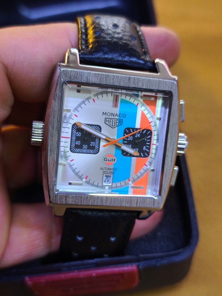 Vintage tarzda, çok renkli kadranlı, gri kare kasalı erkek saati. Siyah deri kayış, iki siyah alt kadran ve tarih göstergesi bulunur. MONACO, Gulf ve HEUER logoları yer alır. ⌚