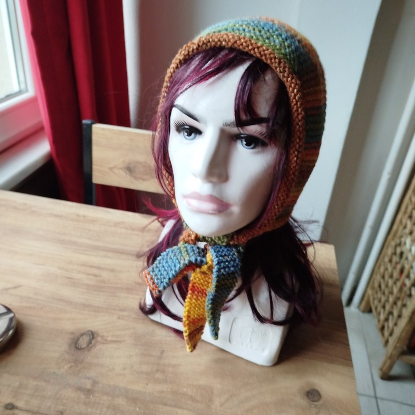 Özenli örgü kaliteli yün. Kadın çok renkli, koyu tonlarda örgü bohem bere, çene altında bağlanır.
