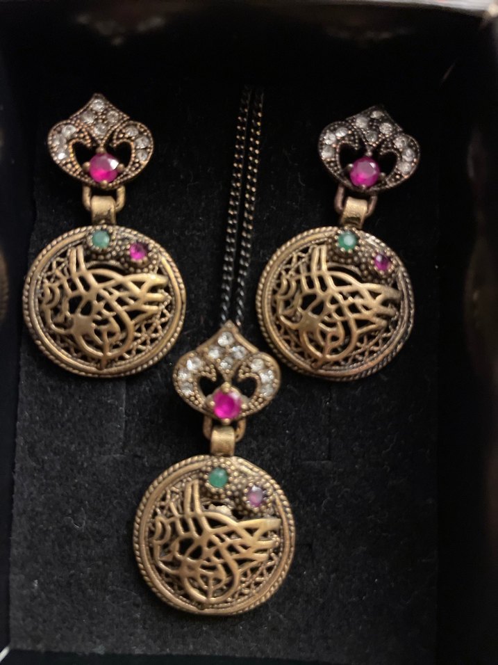 Vintage tarzda, Tuğralı , pirinç kadın takı seti .. Taşları tamdır. Hiç kullanılmamıştır. Sıfır üründür.