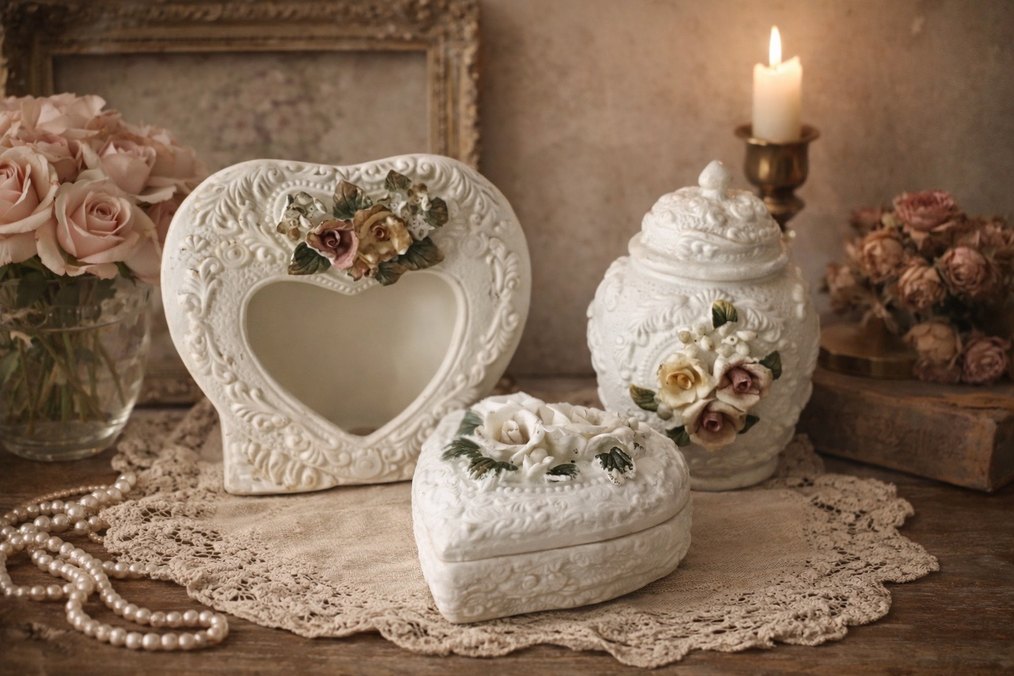 Pastel renkli çiçek detayları ve ince işçilikle süslenmiş beyaz kalp şeklinde figürin. #dekoratif ürünler #vintage