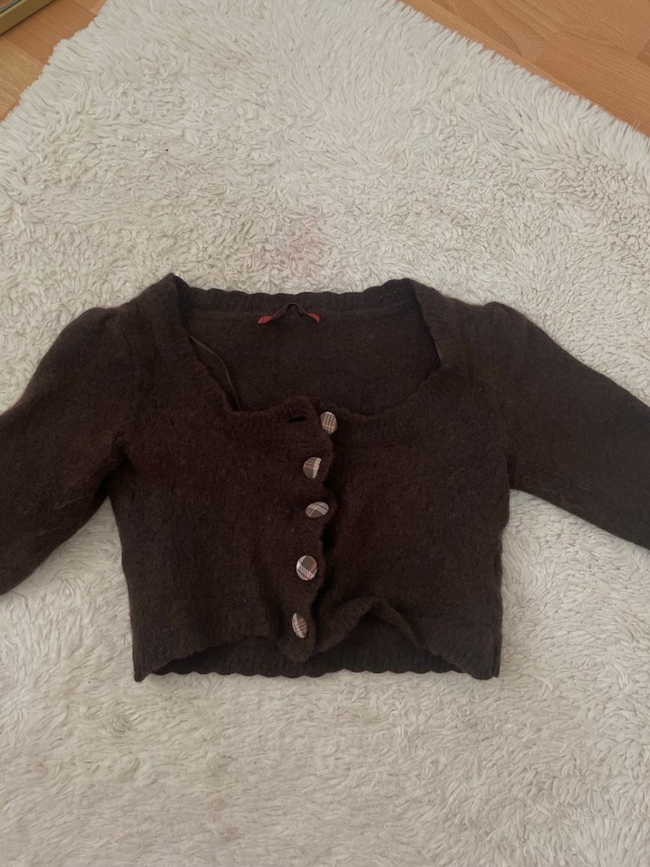 Düğmeli, uzun kollu, kayık yaka kahverengi triko kazak, trend ve rahat bir tarz için uygundur.