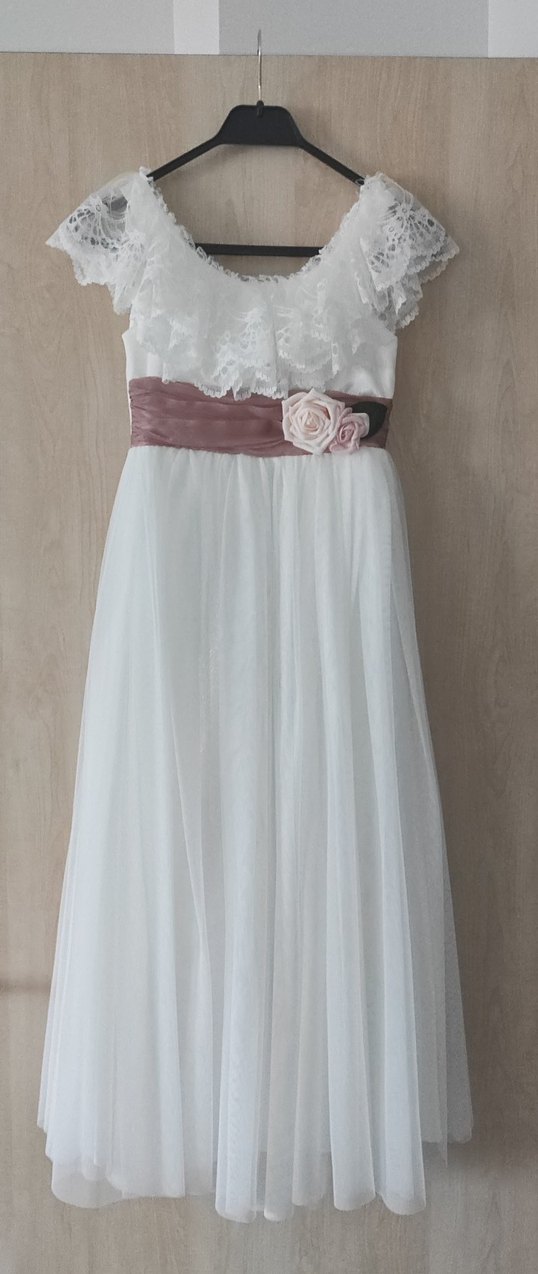 Vintage tarzda, dantel detaylı ve rahat kesime sahip beyaz A kesim gelinlik. Askılı ve straplez yaka, pembe çiçekli kuşak ile uzun model.