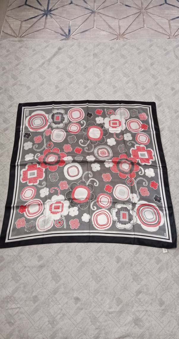 Gri zemin üzerine çok renkli geometrik ve çiçek desenleri bulunan vintage tarzda kadın fular. Sentetik kumaştan, dantel detaylı ve çağdaş bir tasarıma sahip.