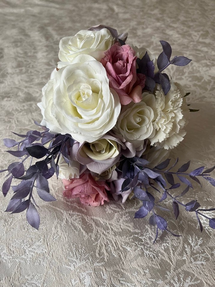 Dantel detaylı, açık mor renkte vintage bohem tarzda gelin çiçeği, beyaz ve pembe çiçeklerle mor yapraklar içerir.