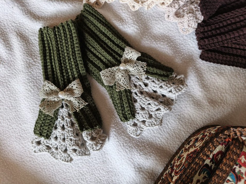 Koyu yeşil ve taş rengi renklerde, dantel kenarlı ve fiyonk detaylı örgü kadın eldiveni, rahat ve bohem tarzda. Uzunluğu 20 cm.