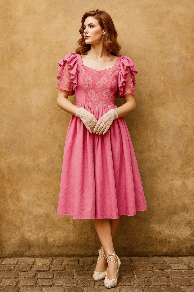 Vintage tarzda, dantel işlemeli ve kısa volanlı kollu pembe midi elbise, bol kesimi ile düğünler için uygundur.