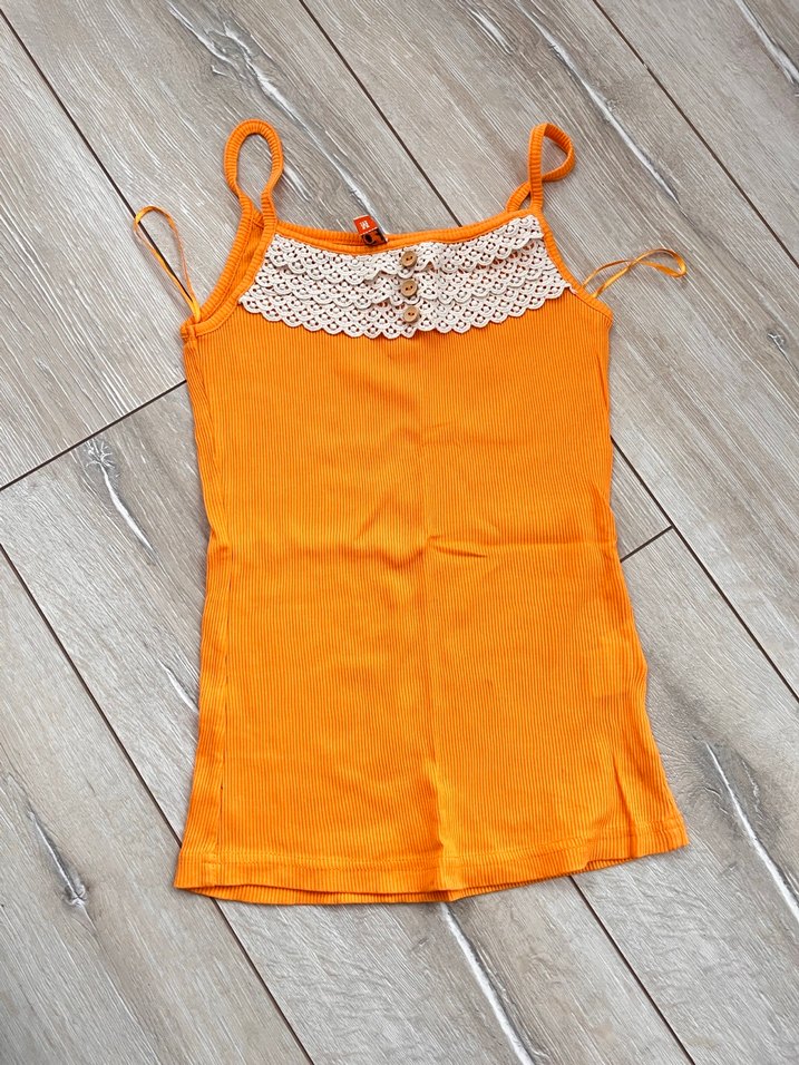 Turuncu renkli, ince askılı ve dantel detaylı straplez yaka bluz. Yumuşak örme kumaştan yapılmış, bohem tarzı yansıtır. Vintage üründür