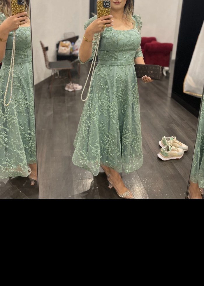 Vintage Dantel İşlemeli Uzun Yeşil Elbise