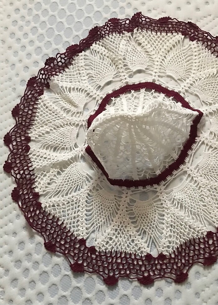 Vintage Dantel Şapka.Badem model.Beyaz ve bordo renk hakim.Fotografların sonunda badem modelin bir benzeri kolalanmış halini paylaştım.şimdi plajlarda çok kullanılan bir ürün
