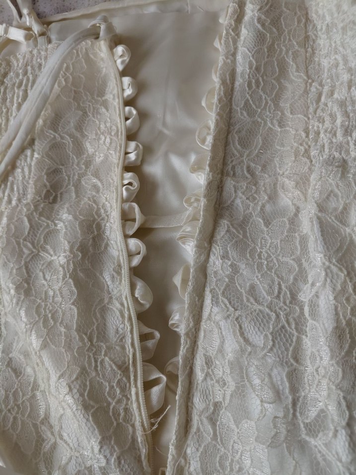 askılı kollu, parlak beyaz dantelden yapılmış, klasik şıklıkta, vücuda oturan vintage parça