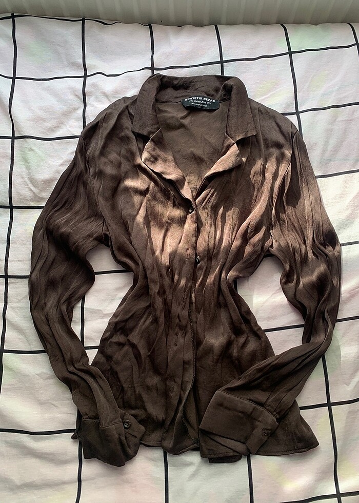 Vintage sentetik sezar dar kalıp gömlek. Dalgalı bir kumaşı var. Hiçbir defosu yok.