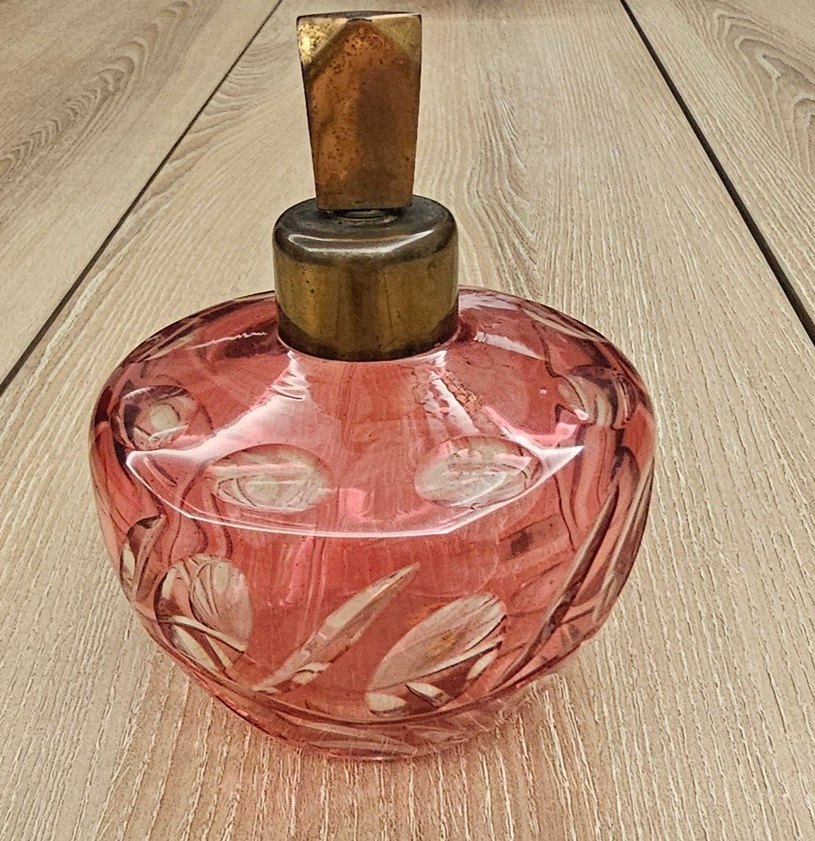 Sağlam ve defosuz. Markası yok. Kesme camdır. En az 50 senelik koleksiyon ürünü...Altın kapaklı, vintage tarzda desenli pembe cam kadın parfüm şişesi.