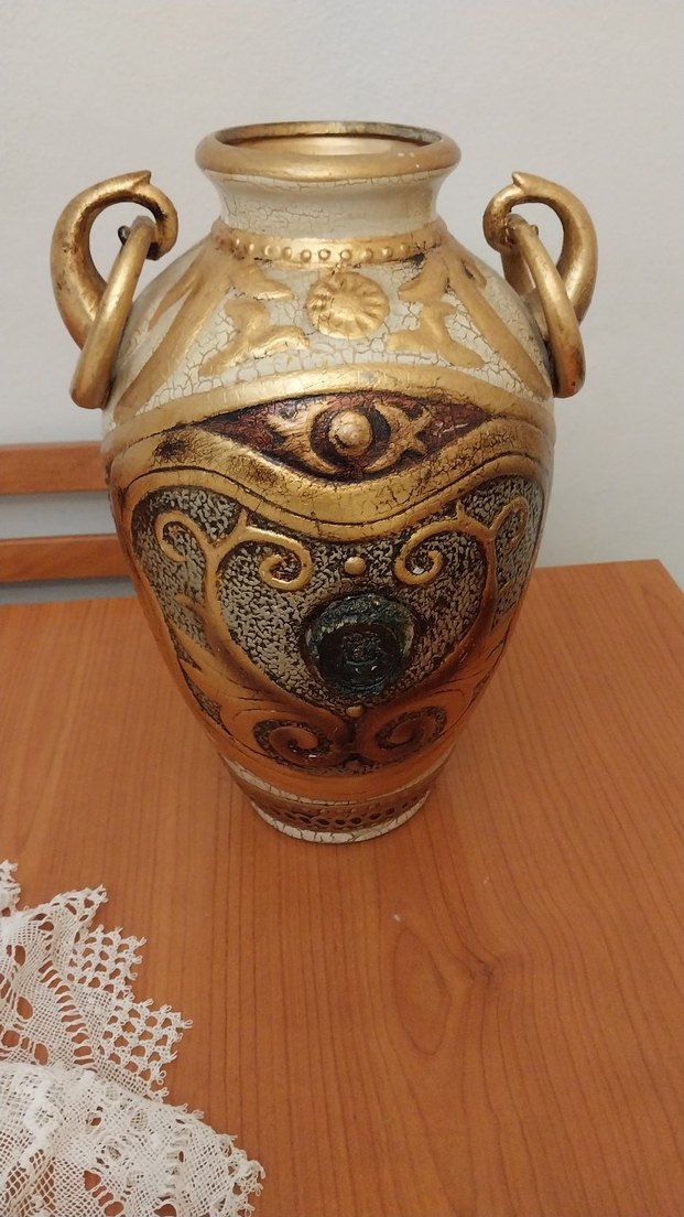 Parlak altın renkli, detaylı desenlere ve önünde benzersiz halka detaya sahip dekoratif vazo. Mekâna zarif bir dokunuş katar. içi toprak dışı işleme küp not : buyuk boy