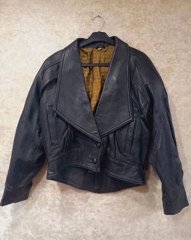 siyah deri biker ceket, düğmeli ön ve kesik yakasıyla, bol kesim ve uzun kollu, günlük kullanım için uygundur.