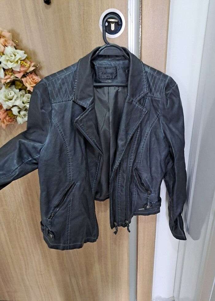 Hiç kullanılmadı fakat dolapta beklemeye bağlı olarak yaka kısmında çoğunluğu görünmeyen soyulma mevcut. Bu sebeple fiyatı uygun tutuyorum. Onun dışında kusuru yoktur. Ölçüleri fotografta mevcuttur. Rengi füme & siyah arası.