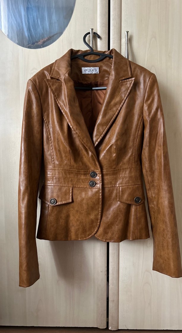 Kahverengi deri, düğmeli, kesik yakalı kadın ceket. Uzun kollu, normal kesim, desen içermeyen klasik tarzda bir modeldir. 1 defa tek giyildi tertemiz hiçbir hasarı yoktur. belden oturtmalıdır vintage tarzda harika bir kalitesi var yumuşak bir deri.