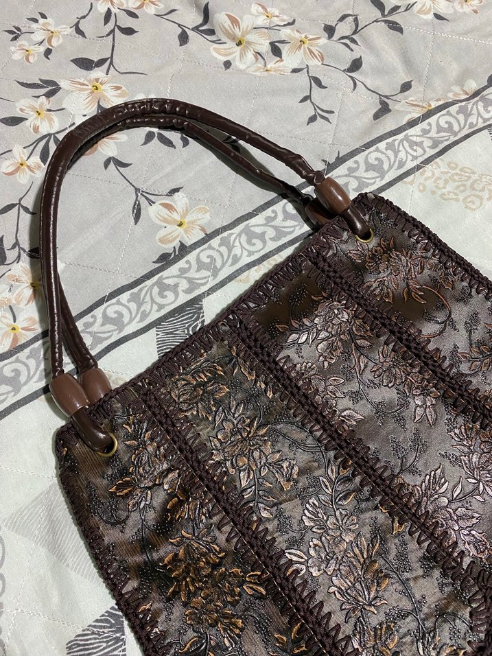 Koyu kahverengi deri çanta, işlemeli çiçek desenleri ve dantel detaylarıyla bohem tarzını yansıtıyor. Dayanıklı saplara ve günlük kullanım için geniş iç hacme sahip.