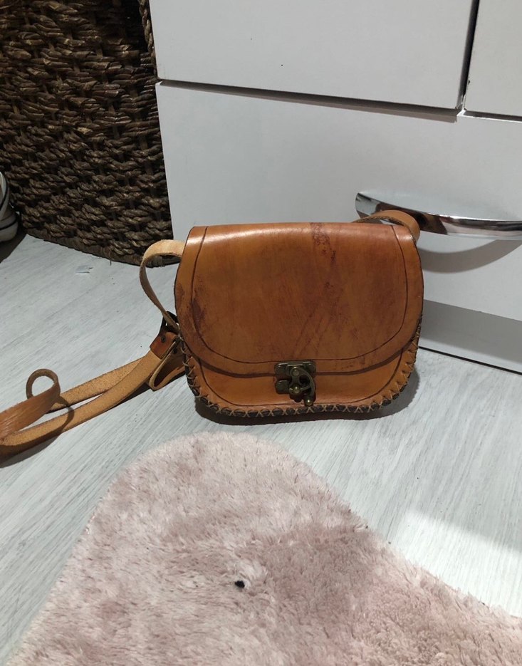 Koyu bej renkte deri çapraz çanta, tokalı kapak ve vintage bohem tarzına sahiptir.sayılı kullandım,sorunu yok
