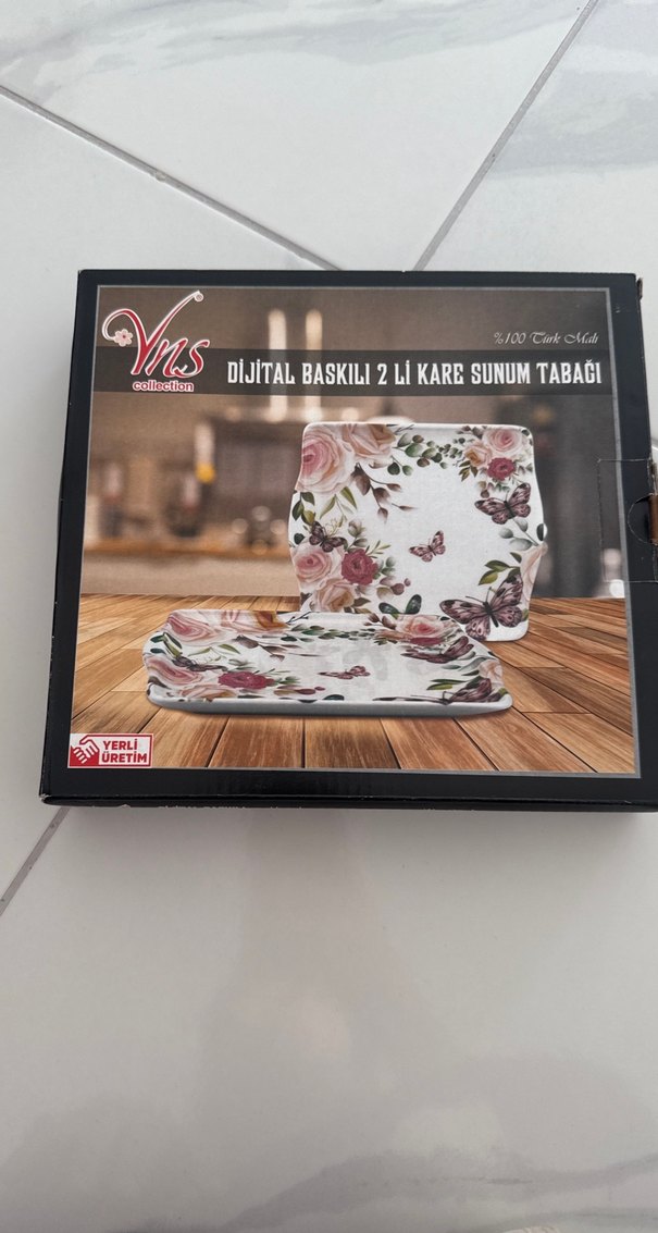 Beyaz zemin üzerinde koyu tonlarda vintage çiçek ve kelebek desenli 2'li kare sunum tabakları. Şık masa düzenleri için uygundur. ️