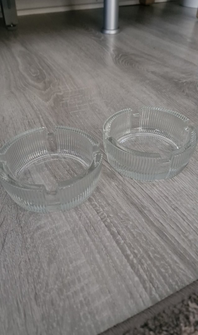 Vintage tarzda, kabartmalı desenli ve iki adet cam küllük seti. Klasik masa takımlarına uygun.