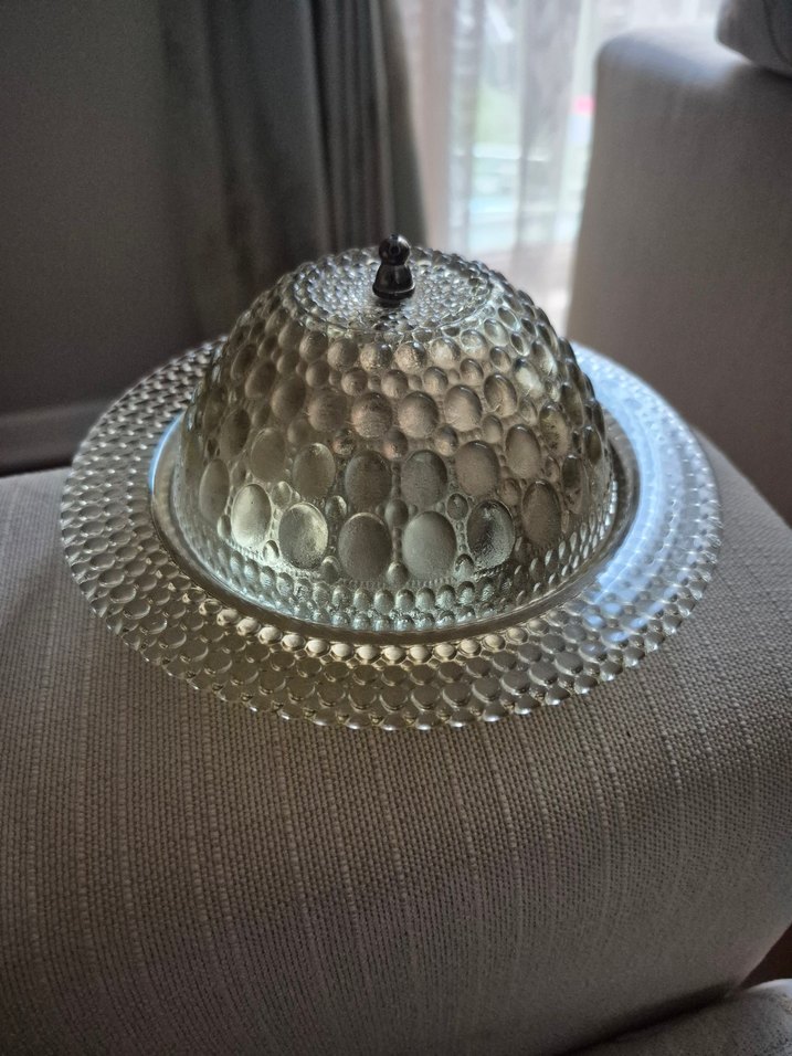Vintage tarzda, yılan desenli dokulu cam peynir tabağı. Beyaz ve gri tonlarda, şık sunum için ideal.