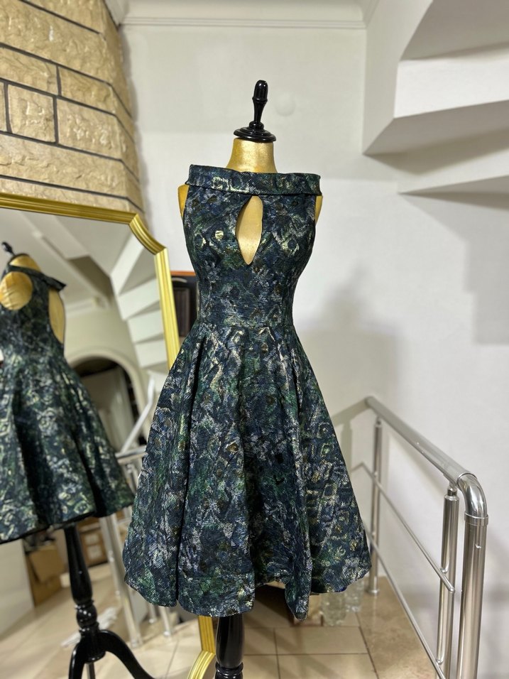 Lacivert renkli, straplez yaka ve kolsuz, pileli etekli vintage desenli uzun abiye elbise. Düğünler için uygun, rahat kesim. 34-36-38 bedenler için uygundur.