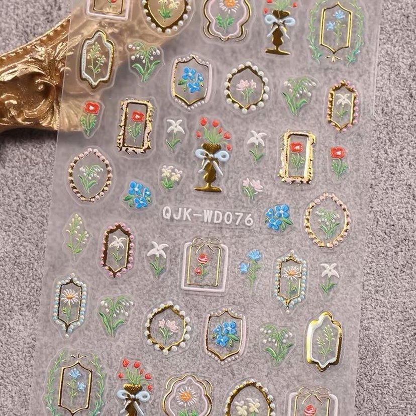 Çeşitli çiçek desenleri ve zarif konturlar içeren tırnak süsleri. Kendinden yapışkanlı ve tek yapraktır