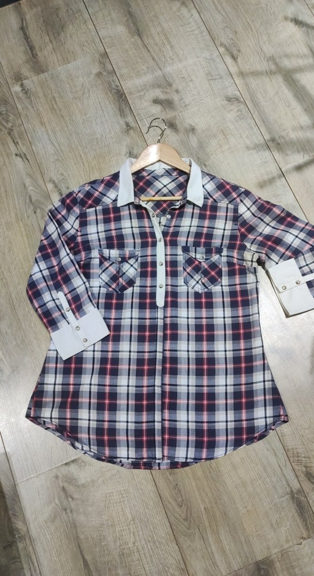 Pamuk kumaştan yapılmış, düğmeli, uzun kollu, yakalı ve cepli renkli kareli kadın gömlek. Rahat kesimiyle günlük sokak stiline uygundur.