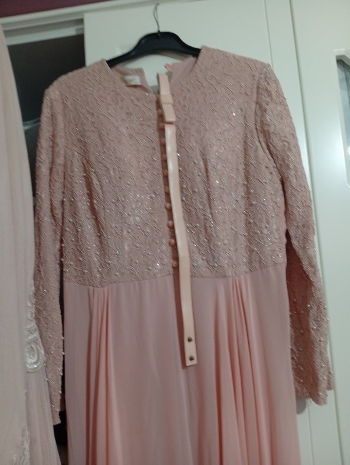 Vintage Düğmeli Pembe Uzun Abiye Elbise