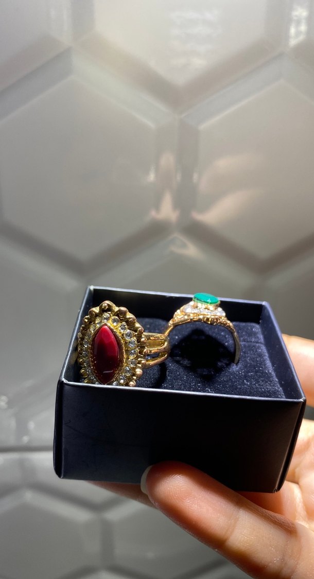 Altın renkli, payetli ve desenli taşlı kadın yüzükleri, vintage bohem tarzıyla klasik zarafeti yansıtıyor.