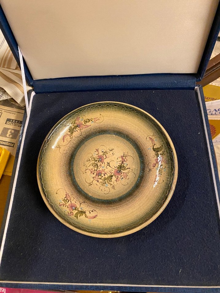 Orijinal mavi kadife hazneli sunum kutusunda (21.5*21.5 cm), 14 cm çapında sanatçı imzalı el boyama vintage seramik duvar tabağı. Krem zemin üzerine yeşil ve pembe/mor tonlarında zarif motiflerle bezenmiş tabağın arkasında, duvara asma teli ve sanatçı imzası (muhtemelen Yunanca "Giannis/Yianni") bulunmaktadır. Ege esintili, şık bir koleksiyon parçasıdır. #vintage #seramik #elboyama #duvartabağı