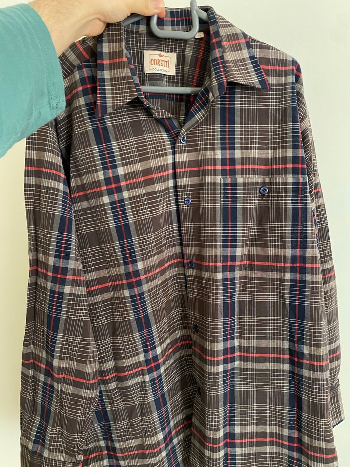 Geniş kesim, düğmeli ve uzun kollu erkek gömleği. Gri ekose desenli, pamuklu ve notalı yaka detaylı, rahat sokak stili için uygundur.