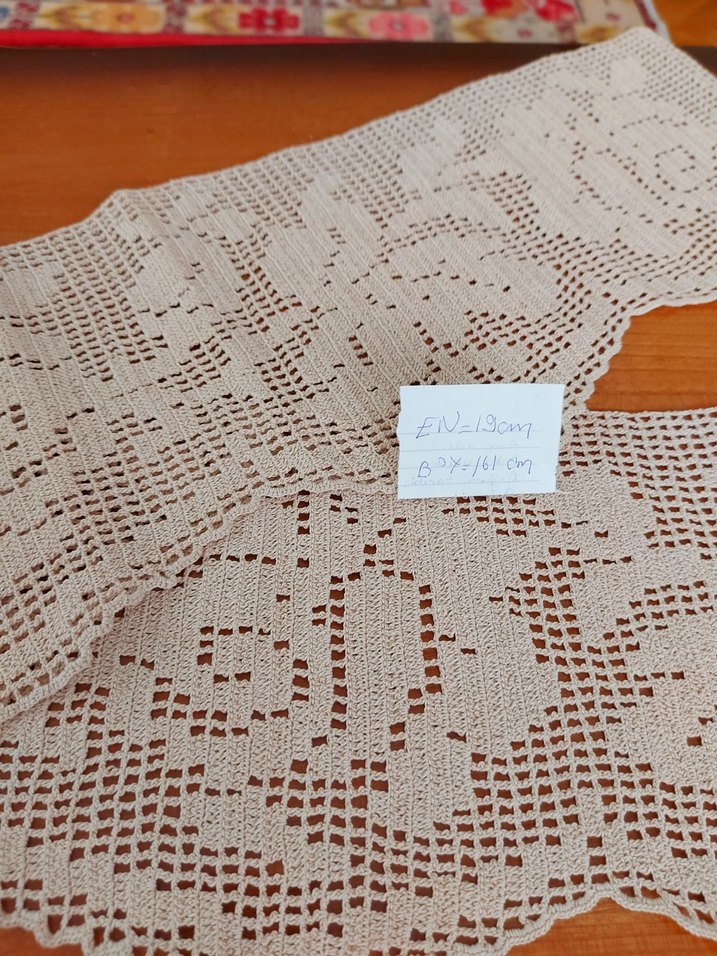 Vintage el örgüsü dantel perde ucu detaylı çiçek desenleriyle ve yaklaşık 130x161 cm ölçülerindedir.