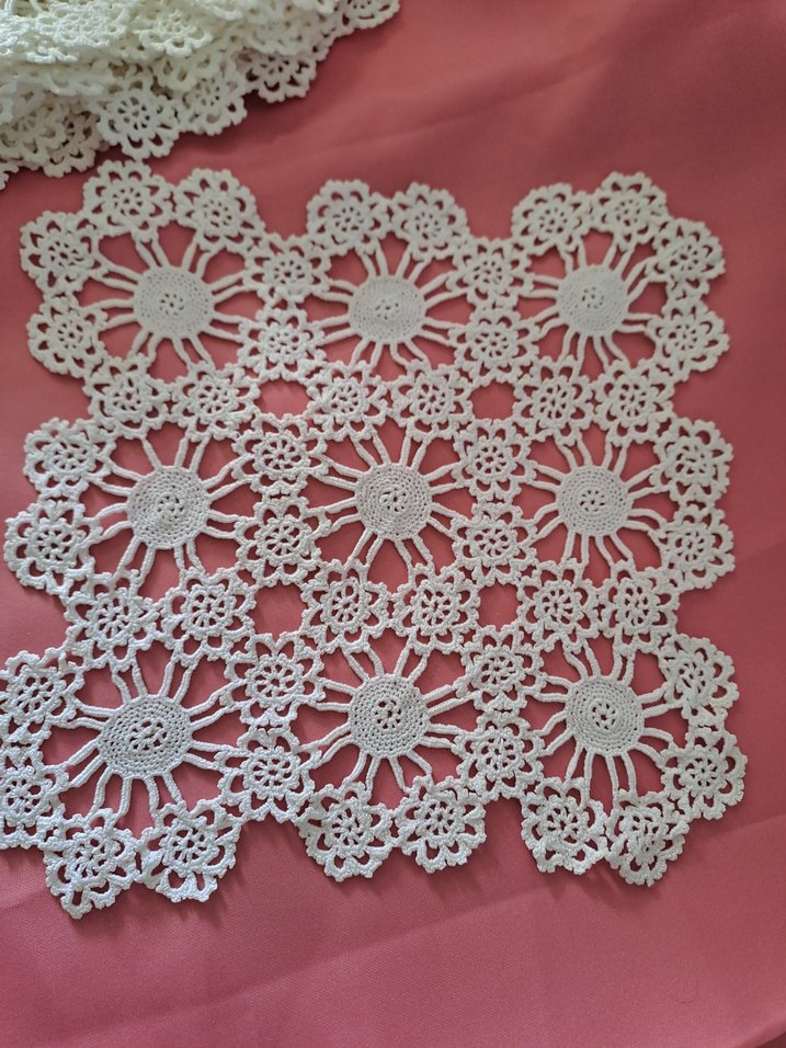 Vintage el yapımı beyaz dantel örtü, çiçek desenleriyle her yüzeye zarif bir dokunuş katıyor. 14 adet vitrin 2 adet sehpa örtüsü ve 170 cm kareli masa örtüsü hic kullanılmadı