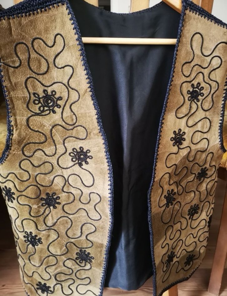 Kahverengi süetten yapılmış, özel dikim, motif işlemeli, V yakalı ve kolsuz. Sadece 1 kez giyildi, bohem tarzda, unisex. Rahat kalıplı, günlük kullanıma uygun. Boy 61, iki koltuk arası 50 cm. Hiçbir sorunu yok.