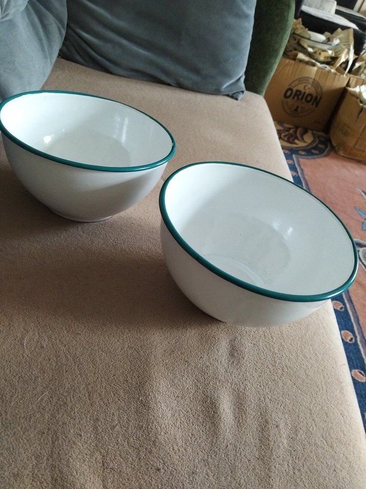 Yeşil kenarlı, dayanıklı malzemeden yapılmış iki beyaz kase, yemek servisinde kullanıma uygun.