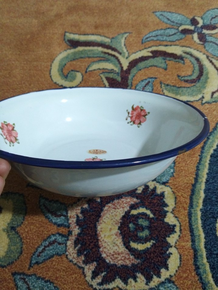 Mavi kenarlı beyaz emaye kase, pastel çiçek desenleriyle klasik tarzda. Servis veya dekorasyon için uygundur.