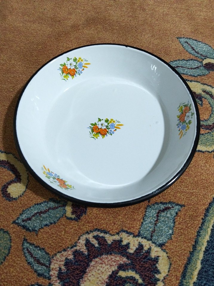 Siyah kenarlı beyaz tabak, üzerinde hafif ve renkli çiçek desenleri bulunur.